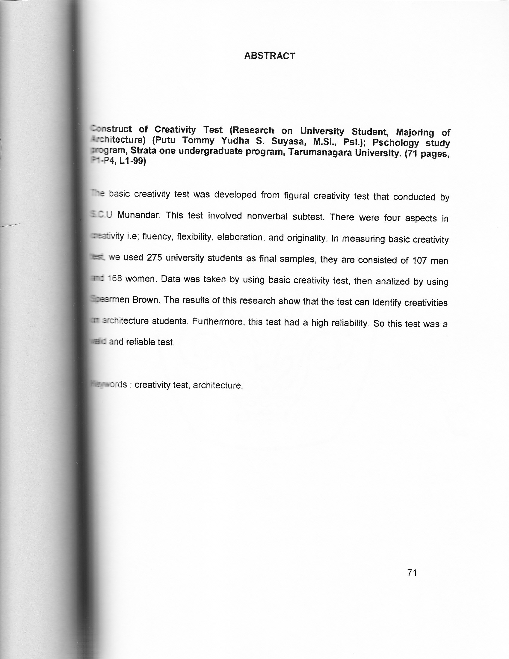 The basic creativity test was developed from figural creativity test that conducted by S.C.U Munandar. This test involved nonverbal subtest. There were four aspects in creativity i.e; fluency, flexibility, elaboration, and originality. In measuring basic creativity test, we used 275 university students as final samples, they are consisted of 107 men and 168 women. Data was taken by using basic creativity test, then analized by using Spearman Brown. The results of this research show that the test can identify creativities on architecture students. Furthermore, this test had a high reliability . So this test was a valid and reliable test.