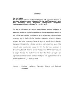 Tujuan penelitian ini adalah untuk mencari hubungan antara kecerdasan emosi dengan perilaku agresi pada remaja tunarungu. Kecerdasan emosi adalah kemampuan atau ketrampilan yang dimiliki individu untuk memotivasi diri, untuk merasakan dan memahami perasaan yang dialami diri sendiri maupun individu lain. Perilaku agresi adalah perilaku yang muncul akibat hasil rangsangan kemarahan yang bertujuan untuk melukai, baik mengganggu, merugikan dan membahayakan individu lain, baik secara langsung maupun tidak langsung. Pengambilan data penelitian ini menggunakan kuesioner yang disebarkan kepada 111 remaja tunarungu di Sekolah Luar Biasa bagian B di Jakarta. Data yang diperoleh diolah dengan menggunakan Correlations Spearman Rho. Hasil penelitian menunjukkan bahwa terdapat hubungan yang negatif dan signifikan antara kecerdasan emosi dengan perilaku agresi pada remaja tunarungu rxy = -0,206, p < 0,05.