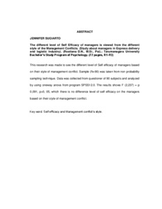 Sugiarto, Jennifer (2008) Perbedaan Tingkat Self-Efficacy pada Manajer ditinjau dari Perbedaan Gaya Manajemen Konflik (Studi pada Manajer di Bidang Industri Jasa Pengiriman Ekspres). Skripsi thesis, Universitas Tarumanagara.
