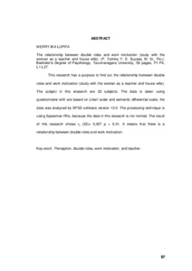 This research has a purpose to find out the relationship between double roles and work motivation (study with the woman as a teacher and house wife). The subject in this research are 22 subjects. The data is taken using questionnaire with are based on Likert scale and semantic differential scale, the data was analyzed by SPSS software version 13.0. The processing technique is using Spearman Rho, because the data in this research is not normal. The result of this research shows rs (22)= 0,307 p < 0,01. It means that there is a relationship between double roles and work motivation.