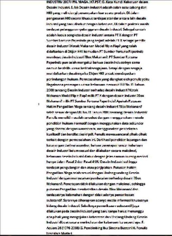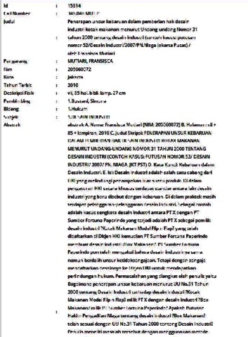 A. Nama: Fransisca Mutiari (NIM: 205060072) B. Halaman: vii + 85 + lampiran, 2010 C. Judul Skripsi: PENERAPAN UNSUR KEBARUAN DALAM PEMBERIAN HAK DESAIN INDUSTRI KOTAK MAKANAN MENURUT UNDANG-UNDANG NOMOR 31 TAHUN 2000 TENTANG DESAIN INDUSTRI (CONTOH KASUS: PUTUSAN NOMOR 52/ DESAIN INDUSTRI/ 2007/ PN. NIAGA. JKT.PST) D. Kata Kunci: Kebaruan dalam Desain Industri. E. Isi: Desain industri adalah salah satu cabang dari HKI yang melindungi penampakan luar suatu produk. Di dalam pengaturan HKI secara khusus terdapat standar antara lain desain industri yang baru disebut dengan kebaruan. Di dalam praktek masih terdapat pelanggaran-pelanggaran desain industri. Sebagai contoh adalah kasus sengketa desain industri antara PT X dengan PT Sumber Fortuna Paperindo yang terjadi adalah PT X sebagai pemilik desain industri ?Kotak Makanan Model Flip n Flap? yang telah didaftarkan di Ditjen HKI kemudian PT Sumber Fortuna Paperindo membuat desain industri ?Box Makanan?. PT Sumber Fortuna Paperindo pun telah mengakui bahwa desain industrinya sama namun berdalih unsur ketidaksengajaan. Tetapi dengan sengaja mendaftarkan desainnya ke Ditjen HKI untuk mendapatkan perlindungan hukum. Permasalahan yang diangkat oleh penulis yaitu Bagaimana penerapan unsur kebaruan menurut UU No.31 Tahun 2000 tentang Desain Industri terhadap desain industri ?Kotak Makanan Model Flip n Flap? milik PT X dengan desain industri ?Box Makanan? milik PT Sumber Fortuna Paperindo? Apakah Putusan Hakim Pengadilan Niaga tentang desain industri ?Box Makanan? telah sesuai dengan UU No.31 Tahun 2000 tentang Desain Industri? Penulis meneliti masalah tersebut dengan menggunakan metode penelitian hukum normatif dengan menggunakan data sekunder yang disertai dengan wawancara, menggunakan pendekatan kualitatif dan bersifat deskriptif. Penulis mewawancarai pihak-pihak terkait dengan permasalahan ini. Dari hasil penelitian lapangan dan keterangan dari narasumber, bahwa penerapan unsur kebaruan desain industri belum sesuai dan dilakukan secara maksimal, kebaruan desain industri diatur dengan jelas namun kurang merinci hanya dalam Pasal 2 dan Pasal 4 UU Desain Industri sehingga terdapat pengulangan dan atau penjiplakan. Putusan Hakim Pengadilan Niaga telah sesuai dengan Undang-undang Desain Industri dengan menyatakan pembatalan terhadap desain ?Box Makanan?. Penerapan tidak dilakukan dengan maksimal, sehingga putusan Pengadilan membatalkan desain ?Box Makanan? dan terdapatnya kelemahan dengan tidak adanya pemeriksaan substantif. Sarannya diharapkan adanya media informasi khususnya bidang desain industri. Sebaiknya pemeriksaan substantif juga dilakukan pada desain industri yang baru tanpa harus menunggu ada pihak yang mengajukan keberatan dan Undang-Undang Desain Industri dibuat secara merinci standar kebaruan itu seperti apa. F. Acuan: 26 (1976-2008) G. Pembimbing Ibu Simona Bustani H. Penulis Fransisca Mutiari