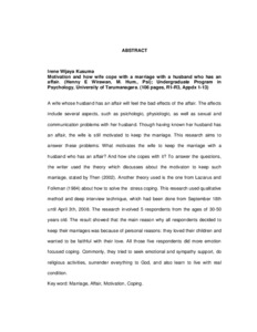 Seorang istri yang suaminya melakukan perselingkuhan akan merasakan dampak-dampak negatif akibat perselingkuhan suaminya. Dampak dari perselingkuhan tersebut meliputi aspek psikologis, fisiologis, serta terganggunya hubungan seksual dan komunikasi dengan suami. Walaupun telah mengetahui suaminya berselingkuh, istri tetap termotivasi untuk mempertahankan pernikahan. Penelitian ini berusaha untuk menjawab permasalahan: Apa yang menjadi motivasi dan coping istri mempertahankan pernikahan yang pasangan hidupnya berselingkuh? Untuk menjawab permasalahan tersebut, digunakan teori yang membahas tentang motivasi mempertahankan pernikahan yang pasangan hidupnya berselingkuh, yang dikemukakan oleh Then (2002). Selain itu, digunakan teori yang membahas tentang penanggulangan stres, yang dikemukakan Lazarus dan Folkman (1984). Penelitian ini menggunakan metode kualitatif dengan teknik wawancara mendalam, dilakukan dalam rentang waktu antara tanggal 18 September 2006 sampai dengan 3 April 2008. Subyek penelitian ini berjumlah 5 orang yang berusia antara 30-50 tahun. Hasil dari penelitian menunjukkan bahwa alasan utama kelima subyek termotivasi mempertahankan pernikahan karena alasan pribadi, yaitu mencintai anak-anak dan kesetiaan terhadap cinta. Kelima subyek lebih banyak melakukan penanggulangan terpusat pada emosi (emotion-focused coping). Secara umum, mereka mencari dukungan emosional dan simpati, berdoa, serta bersikap pasrah dan belajar hidup dengan kondisi yang ada.