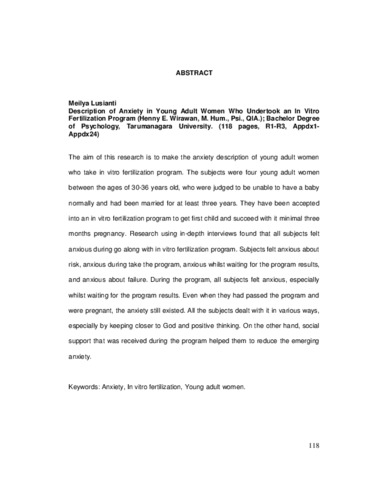 Lusianti, Meilya (2009) Gambaran Kecemasan Wanita Dewasa Muda Yang Mengikuti Program Bayi Tabung (In Vitro Fertization). Skripsi thesis, Universitas Tarumanagara.