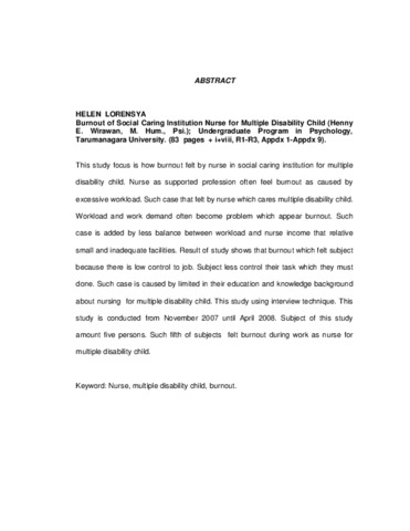 Lorensya, Helen (2008) Kejenuhan Kerja (Burnout) Perawat Panti Sosial Asuhan Anak Tuna Ganda. Skripsi thesis, Universitas Tarumanagara.