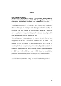 This study aims to determine the meaning of work effects on work engagement. There are three types the meaning of work. Meaning of work refers as calling, job and career. This study included 181 participants who worked as a teacher by using a quantitative non-experimental approach. Analysis of data using multiple linear regression with SPSS for Windows ver. 18.0. The results showed that simultaneous the meaning of work effect on work engagement with F value = 39.916 and significant value (p) 0.000 < 0.01. Meaning of Work can explain the work engagement at 40.4%, while the remaining 59.6% can be explained by other variables. If partially tested, only the meaning of work as calling that have a significant influence on work engagement (t = 2.891, p = 0.004 < 0.01 and beta = 0.729). It can be concluded that participants who had meaning of work as calling will have work engagement.