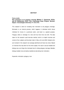 This research is done for revealing men motivation to do polygyny marriage. Motivation is an internal process, which happens in individual which drives individual for moves in a particular action, and lead to a special purpose. Polygyny refers to marriage of a man and has more than one wife. The data taken for this research used interview method, which is in-depth interview and consist of four subjects and has been taken in May until June 2008. Subjects who are involved in this research are average adulthood and have two wives. Based on interview that was done for the entire subject, the result is sexual needed and biology care, are things that motivated men for doing polygyny marriage. Besides biology needed, love and safety needed are also being men motivation.