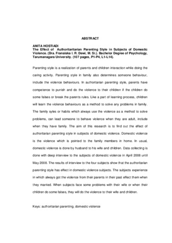 Hostiadi, Anita (2008) Dampak Pola Asuh Authoritarian Pada Pelaku Kekerasan Dalam Rumah Tangga. Skripsi thesis, Universitas Tarumanagara.