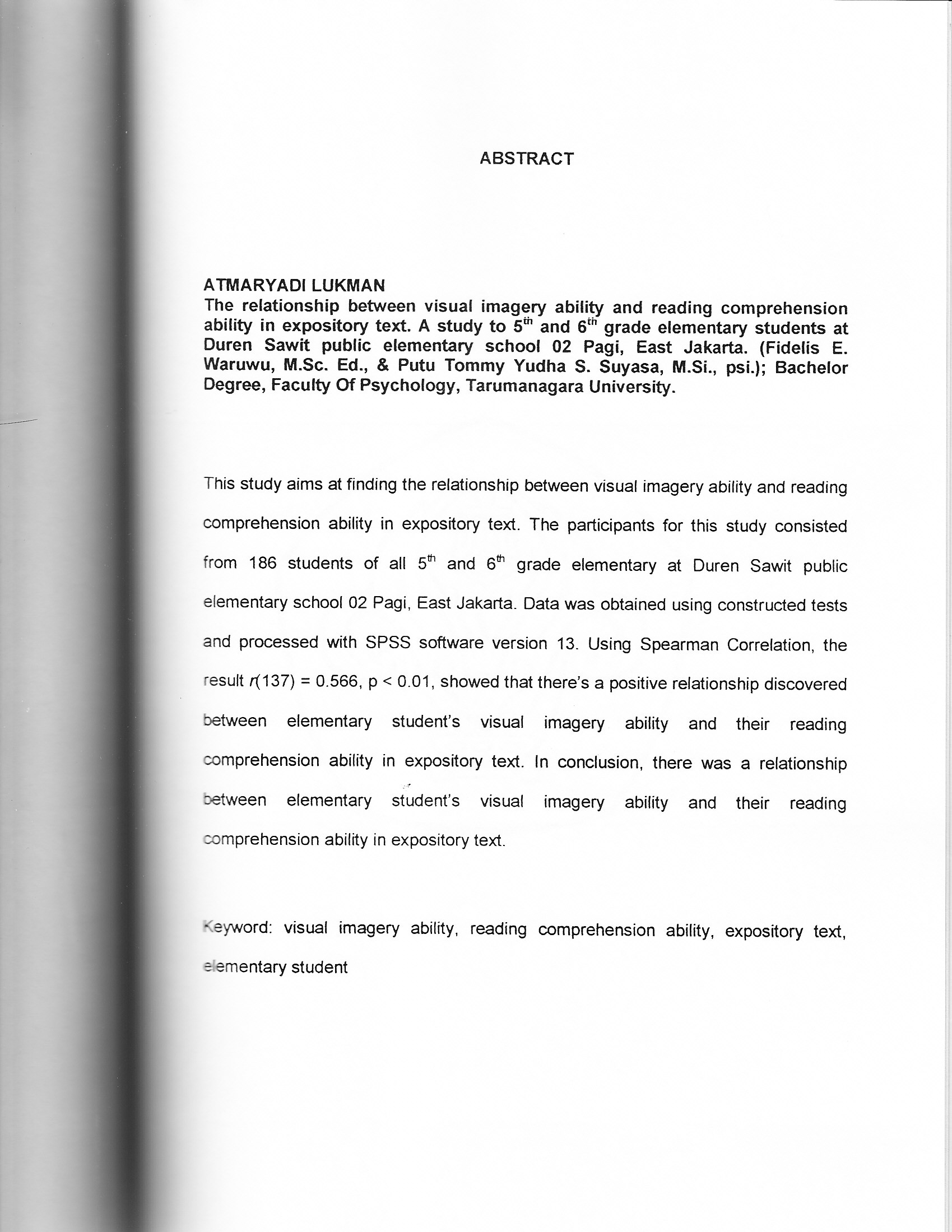 Lukman, Atmaryadi (2005) Hubungan Antara Kemampuan Visual Imagery Dengan Kemampuan ngomPemahaman Membaca Pada Bacaan Jenis Ekspositori. Sebuah Studi Pada Siswa Kelas 5 Dan 6 Sekolag Dasar Negeri Duren Sawit 02 Pagi, Jakarta Timur. Skripsi thesis, Universitas Tarumanagara.