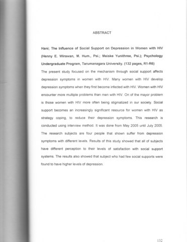 The present study focused on the mechanism through social support affects depression symptoms in women with HIV. Many women with HIV develop depression symptoms when they first become infected with HIV. Women with HIV encounter more multiple problems than men with HIV. On of the mayor problem is those women with HIV more often being stigmatized in our society. Social support becomes an increasingly significant resource for women with HIV as strategy coping, to reduce their depression symptoms. This research is conducted using interview method. It was done from May 2005 until July 2005 . The research subjects are four people that shown suffer from depression symptoms with different levels. Results of this study showed that all of subjects have different perception to their levels of satisfaction with social support systems. The results also showed that subject who had few social supports were found to have higher levels of depression.