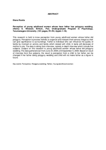 Rosita, Diana (2008) Persepsi Perempuan Dewasa Muda Tentang Figure Ayah Yang Melakukan Poligini. Skripsi thesis, Universitas Tarumanagara.