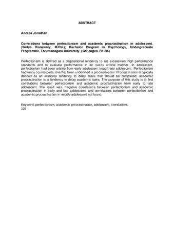 Jonathan, Andrea (2008) Hubungan Antara Perfeksionisme Dengan Prokrastinasi Akademik Pada Remaja. Skripsi thesis, Universitas Tarumanagara.