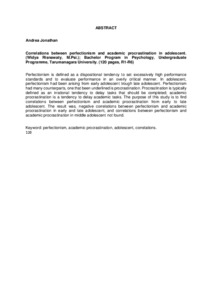 Perfectionism is defined as a dispositional tendency to set excessively high performance standards and to evaluate performance in an overly critical manner. In adolescent, perfectionism had been arising from early adolescent trough late adolescent. Perfectionism had many counterparts, one that been underlined is procrastination. Procrastination is typically defined as an irrational tendency to delay tasks that should be completed; academic procrastination is a tendency to delay academic tasks. The purpose of this study is to find correlations between perfectionism and academic procrastination from early to late adolescent. The result was, negative correlations between perfectionism and academic procrastination in early and late adolescent, and correlations between perfectionism and academic procrastination in middle adolescent not found.
