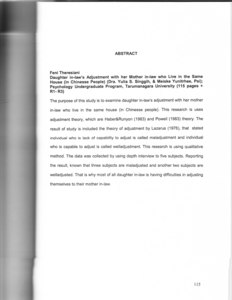 The purpose of this study is to examine daughter in-law's adjustment with her mother in-law who live in the same house (in Chinesse people). This research is uses adjustment theory, which are Haber&Runyon (1983) and Powell (1983) theory. The result of study is included the theory of adjustment by Lazarus (1976), that stated individual who is lack of capability to adjust is called maladjustment and individual who is capable to adjust is called welladjustment. This research is using qualitative method. The data was collected by using depth interview to five subjects. Reporting the result, known that three subjects are maladjusted and another two subjects are welladjusted. That is why most of all daughter in-law is having difficulties in adjusting themselves to their mother in-law.