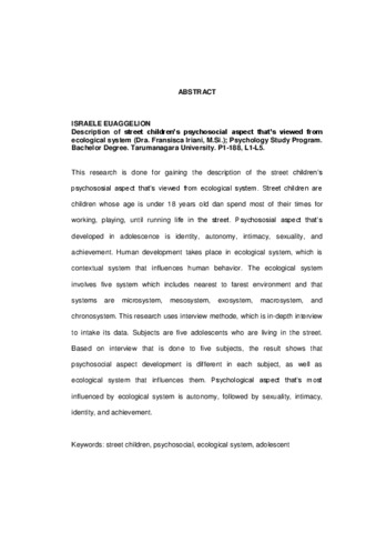 Euaggelion, Israele (2008) Gambaran Aspek Psikososial Pada Anak Jalanan Ditinjau Dari System Ekologis. Skripsi thesis, Universitas Tarumanagara.