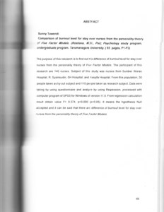 The purpose of this research is to find out the difference of burnout level for stay over nurses from the personality theory of Five Factor Models. The participant of this research are 140 nurses. Subject of this study was nurses from Sumber Waras Hospital, R. Syamsudin, SH Hospital; and Assyifa Hospita l. From this population, 30 people taken as try out subject and 11O people taken as research subject. Data were taking by using questionnaire and analyze by using Regression, processed with computer program of SPSS for Windows of version 11.0 . From regression calculation result obtain value F= 9.374 , p=0,000 (p<0.05). It means the hypothesis Null accepted and it can be said that there are difference of burnout level for stay over nurses from the personality theory of Five Factor Models.