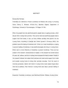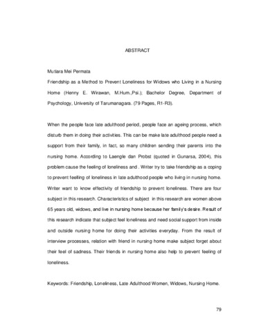 Permata, Mutiara Mei (2008) Pertemanan Sebagai Cara Mengatasi Kesepian Wanita Janda Penghuni Panti Wreda. Skripsi thesis, Universitas Tarumanagara.