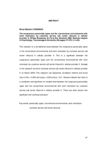This research is a correlational study between the congruence personality types to the conventional environmental and work motivation by customer service call center inbound in cellular provider X. This is a significant between the congruence personality types and the conventional environmental with work motivation by customer service call center inbound in cellular provider X. Sample in this research are all of customer service call center inbound in cellular provider X on March 2009. This research use Spearman correlation method and found that n(139) = 0.259 with p/sig = 0,002 and p< 0,01. Results indicate that there is a correlation and significant on modest level between the congruence personality types and the conventional environmental with work motivation by customer service call center inbound in cellular provider X. There are other factors that significant with working motivation.
