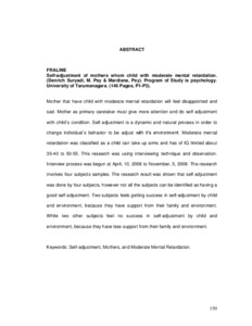 Mother that have child with moderate mental retardation will feel disappointed and sad. Mother as primary caretaker must give more attention and do self adjustment with child`s condition. Self adjustment is a dynamic and natural process in order to change individual`s behavior to be adjust with it’s environment. Moderate mental retardation was classified as a child can take up arms and has of IQ limited about 35-40 to 50-55. This research was using interviewing technique and observation. Interview process was begun at April, 10, 2008 to November, 5, 2008. The research involves four subjects samples. The research result was shown that self adjustment was done by four subjects, however not all the subjects can be identified as having a good self adjustment. Two subjects feels getting success in self-adjustment by child and environment, because they have support from their family and environment. While two other subjects feel no success in self-adjustment by child and environment, because they have less support from their family and environment.