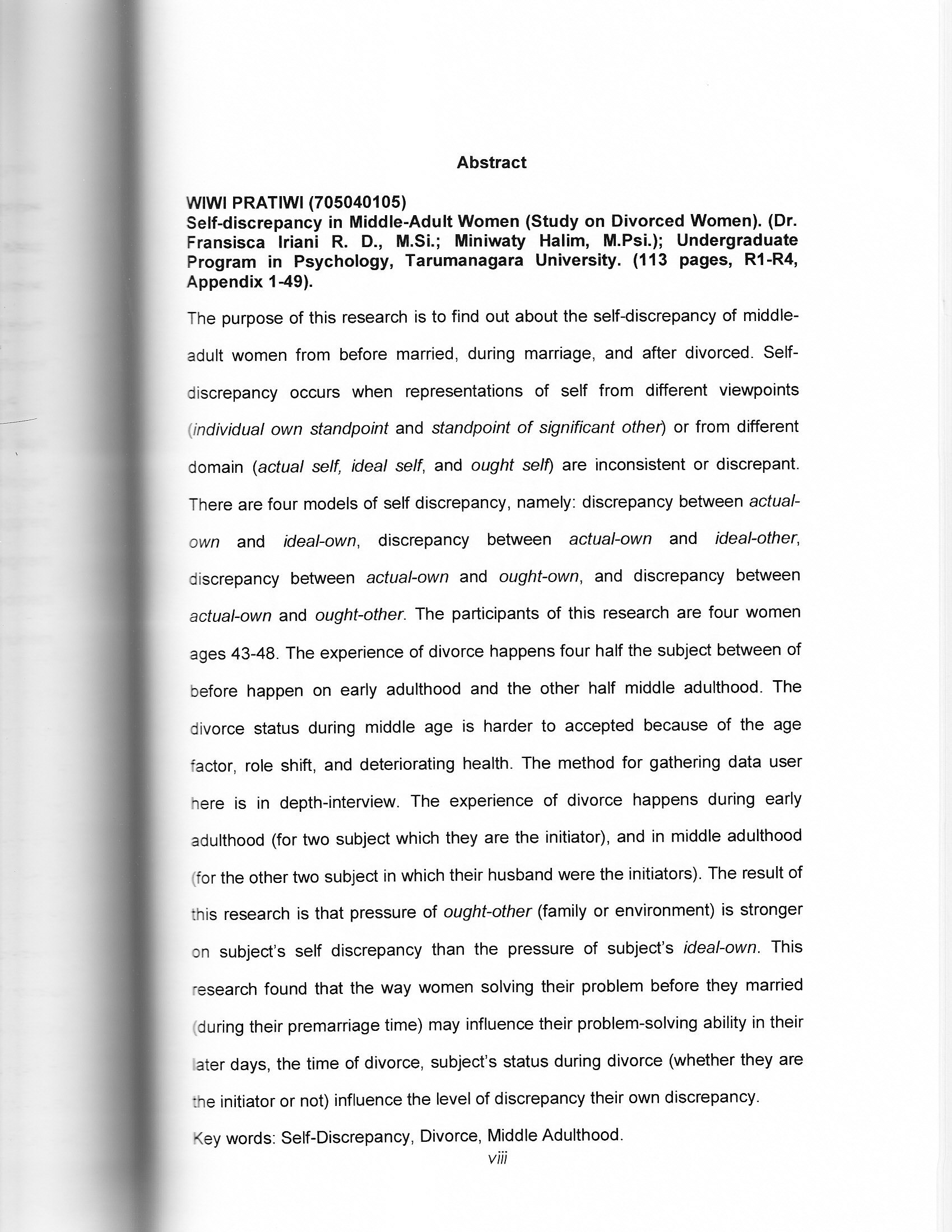 The purpose of this research is to find out about the self-discrepancy of middle adult women from before married, during marriage, and after divorced Self- discrepancy occurs when representations of self from different viewpoints (individual own standpoint and standpoint of significant other) or from different domain (actual self, ideal self, and ought self) are inconsistent or discrepant. There are four models of self discrepancy, namely: discrepancy between actual- own and ideal-own, discrepancy between actual-own and ideal-other, discrepancy between actual-own and ought-own, and discrepancy between actual-own and ought-other. The participants of this research are four women ages 43-48. The experience of divorce happens four half the subject between of before happen on early adulthood and the other half middle adulthood. The divorce status during middle age is harder to accepted because of the age f·actor, role shift, and deteriorating health. The method for gathering data user here is in depth-interview. The experience of divorce happens during early adulthood (for two subject which they are the initiator), and in middle adulthood ,for the other two subject in which their husband were the initiators). The result of his research is that pressure of ought-other (family or environment) is stronger on subject's self discrepancy than the pressure of subject's ideal-own. This r·esearch found that the way women solving their problem before they married (during their premarriage time) may influence their problem-solving ability in their later days, the time of divorce, subject's status during divorce (whether they are the initiator or not) influence the level of discrepancy their own discrepancy .