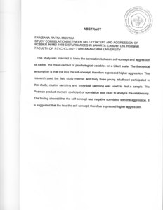 This study was intended to know the correlation between self-concept and aggression pf robber, the measurement of psychological variables on a likert scale. The theoritical assumption is that the less the self-concept, therefore expressed higher aggression. This research used the field study, cluster sampling and snow-ball sampling was used to find a sample. The Pearson product moment coeficient of correlation was used to analyze the realitionship. The finding showed that the self-concept was negative correlated with the aggression. It is suggested that the less the self concpet, therefore expressed higher aggression