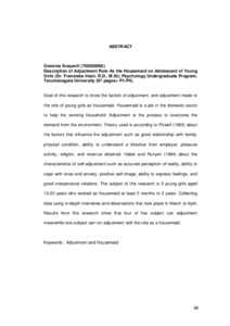 Goal of this research to know the factors of adjustment, and adjustment made to the role of young girls as housemaid. Housemaid is a job in the domestic sector to help the working household. Adjustment is the process to overcome the demand from the environment. Theory used is according to Powell (1983) about the factors that influence the adjustment such as good relationship with family, physical condition, ability to understand a directive from employer, pleasure activity, religion, and revenue obtained. Haber and Runyon (1984) about the characteristics of self-adjustment such as accurate perception of reality, ability to cope with stres and anxiety, positive self image, ability to express feelings, and good interpersonal relations. The subject of this research is 5 young girls aged 10-20 years who worked as housemaid at least 5 months to 2 years. Collecting data using in-depth interviews and observations that took place in March to April. Results from this research show that four of five subject can adjustment meanwhile one subject can not adjustment with the role as a housemaid.