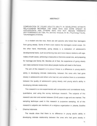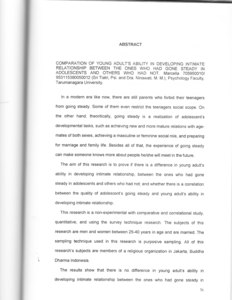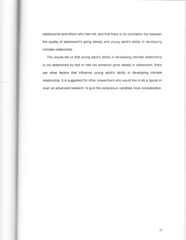 is not determined by had or had not someone gone steady in adolescent; there are other factors that influence young adult’s ability in developing intimate relationship. It is suggested for other researchers who would like to do a typical or even an advanced research, to give the extraneous variables more consideration.