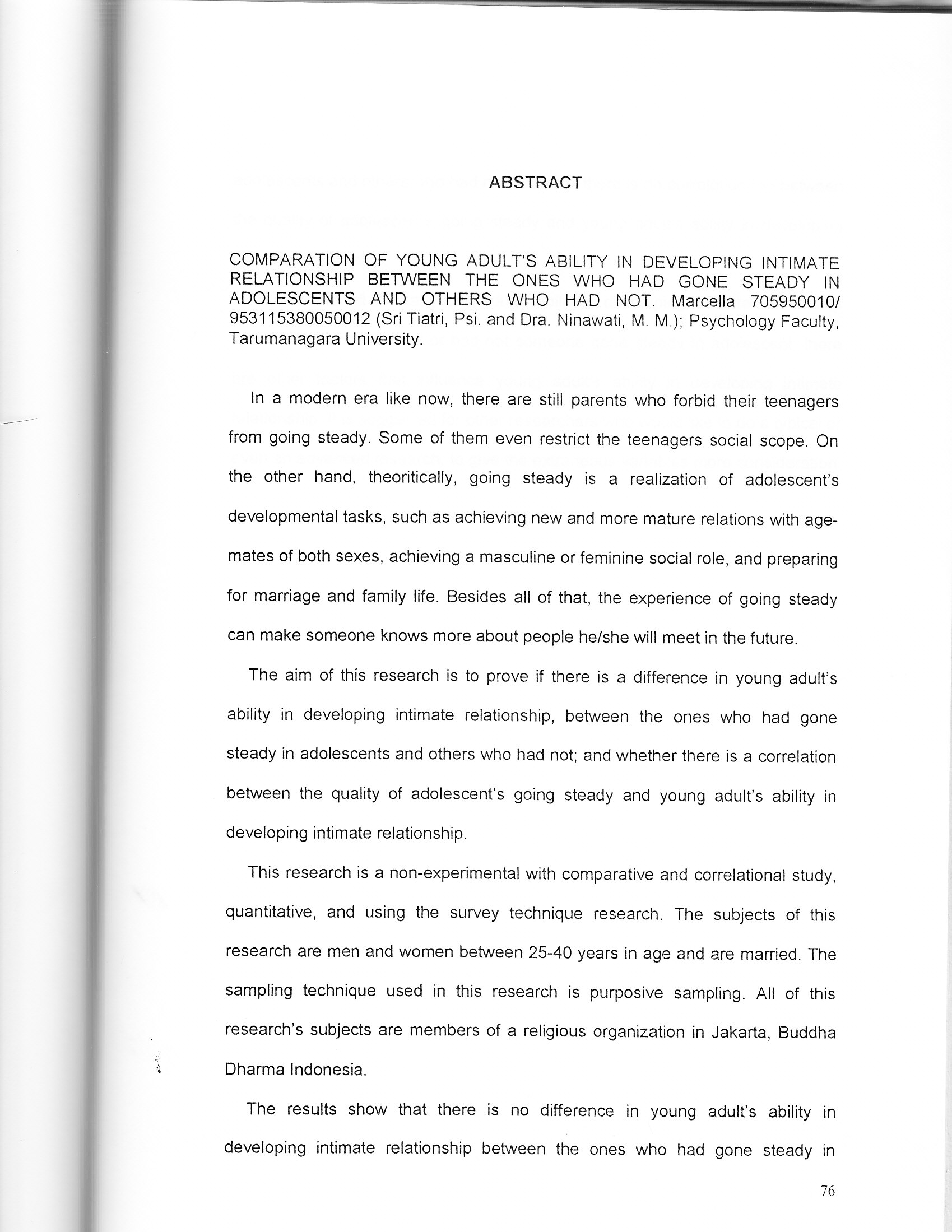 In a modern era like now, there are still parents who forbid their teenagers from going steady. Some of them even restrict the teenagers social scope. On the other hand, theoritically, going steady is a realization of adolescents developmental tasks, such as achieving new and more mature relations with age- mates of both sexes, achieving a masculine or feminine social role, and preparing for marriage and family life. Besides all of that, the experience of going steady can make someone knows more about people he/she will meet in the future. The aim of this research is to prove if there is a difference in young adult’s ability in developing intimate relationship, between the ones who had gone steady in adolescents and others who had not; and whether there is a correlation between the quality of adolescents going steady and young adult’s ability in developing intimate relationship. This research is a non-experimental with comparative and correlational study, quantitative, and using the survey technique research. The subjects of this research are men and women between 25-40 years in age and are married. The sampling technique used in this research is purposive sampling. All of this research’s subjects are members of a religious organization in Jakarta, Buddha Dharma Indonesia. The results show that there is no difference in young adult’s ability in developing intimate relationship between the ones who had gone steady in adolescents and others who had not, and that there is no correlation too between the quality of adolescent’s going steady and young adults ability in developing