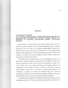 research is to explore and find some patterns of youth’s anxiety in dealing with the problems of death of their parents. This research utilizes Rogerian theory with his teleological orientation in its approaches. Rogers believed that in every person lies potentials to grow and to develop progressively so that a person will have the opportunity to attain his or her life goals. Rogers also believed that anxiety was basically based on the uncertainties of future changes. However, a person, on the contrary, may also have chances to utilize his or her anxiety to achieve self-actualization and consistency. in regard to his research the Rogerian theory was considered appropriate to explain how youths deal with their anxiety of feelings of loss due to parental death, and how do they go through the resolution processes. This research also includes the three-phase theory being proposed by Brown. Standemire, and Schultz. The theory describes the sequences in which a person must go through in dealing with anxiety of loss due to death and dying process of a beloved person. These phases are surprised and disbelief, remembering, and resolution. Observation and interview were used. as method for data collection. There were four respondents participated in this research. Two respondents were boys, two were girls, and their age range was 16 to 23 years. Qualitative analysis of the collected data was utilized, and some conclusions were drawn based on the analysis. All respondents experienced anxiety related to the feeling of loss of their parents"" death in various sequences and various length of period of bereavement. But, by being able to go through the phase of anxiety, they become more able to deal with the challenge of live in the future. Those their action, according to Rogers is base of tendency every person achieved a purpose self actualization and consistency.