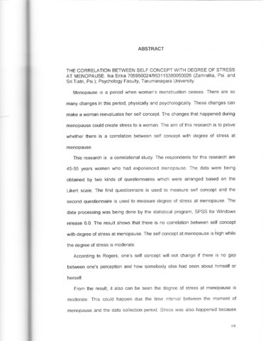 "Menopause IS a period when woman’s menstruation ceases. There are so many changes in this period, physically and psychologically. These changes can make a woman reevaluates her self concept. The changes that happened during menopause could create stress to a woman. The aim of this research is to prove whether there is a correlation between self concept with degree of stress at menopause