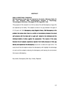 Penelitian ini bertujuan untuk mengetahui diskrepansi diri pada gay yang ditolak oleh keluarganya. Subyek berjumlah enam orang gay yang berusia antara 21-33 tahun. Diskrepansi diri menggunakan teori Higgins. Diskrepansi diri adalah permasalahan yang timbul ketika terjadi pertentangan atau ketidaksesuaian antara diri aktual seseorang dengan diri ideal atau diri seharusnya yang berkaitan dengan individu dan keyakinan individu terhadap penilaian orang lain terhadap dirinya. Hasil penelitian ini menggambarkan bahwa semua subyek mengalami penolakan dari keluarga karena identitas gay mereka dan mengalami diskrepansi actual own vs ideal dan ought other. Penelitian ini menemukan bahwa semua subyek mengurangi diskrepansi dengan cara menonjolkan kelebihan dalam pekerjaan dan lima subyek mengurangi diskrepansi dengan cara meninggalkan lingkungan yang menyebabkan terjadinya diskrepansi.