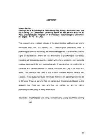 Penelitian ini bertujuan untuk mengetahui gambaran psychological well-being gay dewasa awal yang belum coming out. Psychological well-being adalah kesejahteraan psikologis yang dapat ditandai dengan diperolehnya kebahagiaan, kepuasan hidup dan tidak adanya gejala-gejala depresi. Terdapat enam dimensi dalam psychological well-being, yaitu penerimaan diri, hubungan hangat dengan orang lain, otonomi, penguasaan lingkungan, tujuan hidup, dan pertumbuhan pribadi. Seorang gay yang belum coming out adalah seorang yang belum mengakui orientasi seksualnya sebagai gay kepada keluarga dan teman-temannya. Pengambilan data dalam penelitian ini dilakukan dengan menggunakan metode wawancara terhadap empat orang subyek. Subyek penelitian ini adalah laki-laki gay berusia 20-30 tahun, yang belum coming out. Berdasarkan hasil penelitian, dapat disimpulkan bahwa seorang gay yang belum coming out kurang mampu menunjukkan psychological well-being di setiap dimensinya.