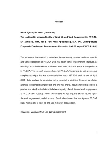 The purpose of this research is to analyze the relationship between quality of work life and work engagement at PT.GAA. Data was taken from 340 permanent employee, at least high school education or equivalent, and have minimal 2 years work experience in PT.GAA. The research was conducted at PT.GAA, Tangerang, by using purposive sampling technique that was conducted since March 18th 2015 until the end of April, 2015. Data analysis is conducted using descriptive statistics, Pearson correlation analysis, independent sample t-test, and one-way anova. Result showed that there is a positive and significant relationship between quality of work life and work engagement at PT.GAA with r=0,550, p=0,000, which means the higher quality of work life, the higher the work engagement, and vice versa. Result also showed that employee at PT.GAA has a high quality of work life and also high work engagement