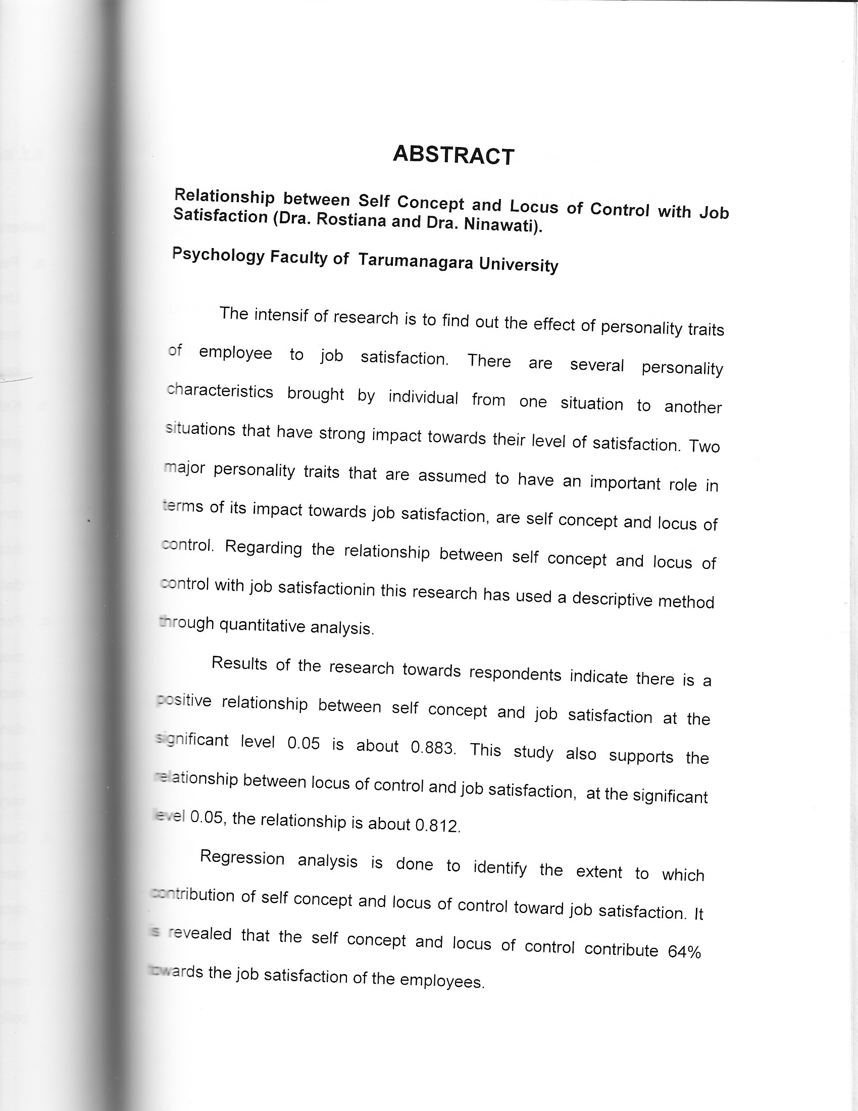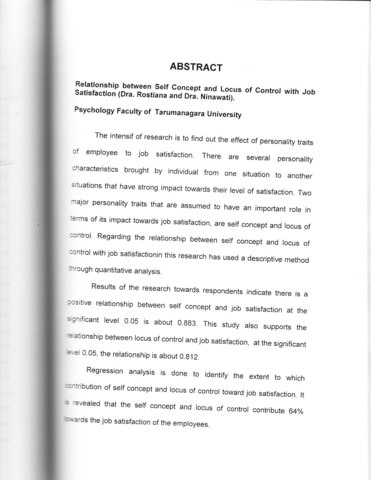 Results of the research towards respondents indicate there is a positive relationship between self concept and job satisfaction at the significant level 0.05 is about 0.883. This study also supports the relationship between locus of control and job satisfaction, at the significant level 0.05, the relationship is about 0.812. Regression analysis is done to identify the extent to which contribution of self concept and locus of control toward job satisfaction. is revealed that the self concept and locus of control contribute 64% towards the job satisfaction of the employees. T-test analysis indicates that there is difference of level of job satisfaction among the employees based on age, sex, education level, position, and according to department or division in the company. Finally, researcher hope this study will have the benefit to society to Jnderstand the job satisfaction more well, decrease the turn over of the employee, and increase the level ofjob satisfaction."