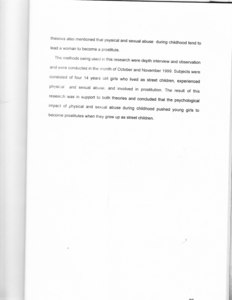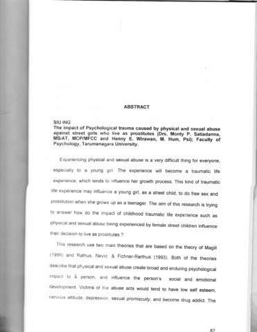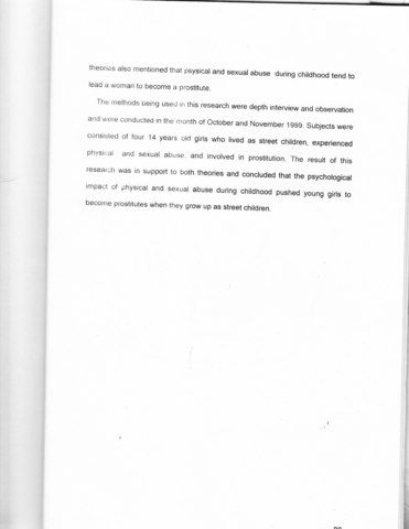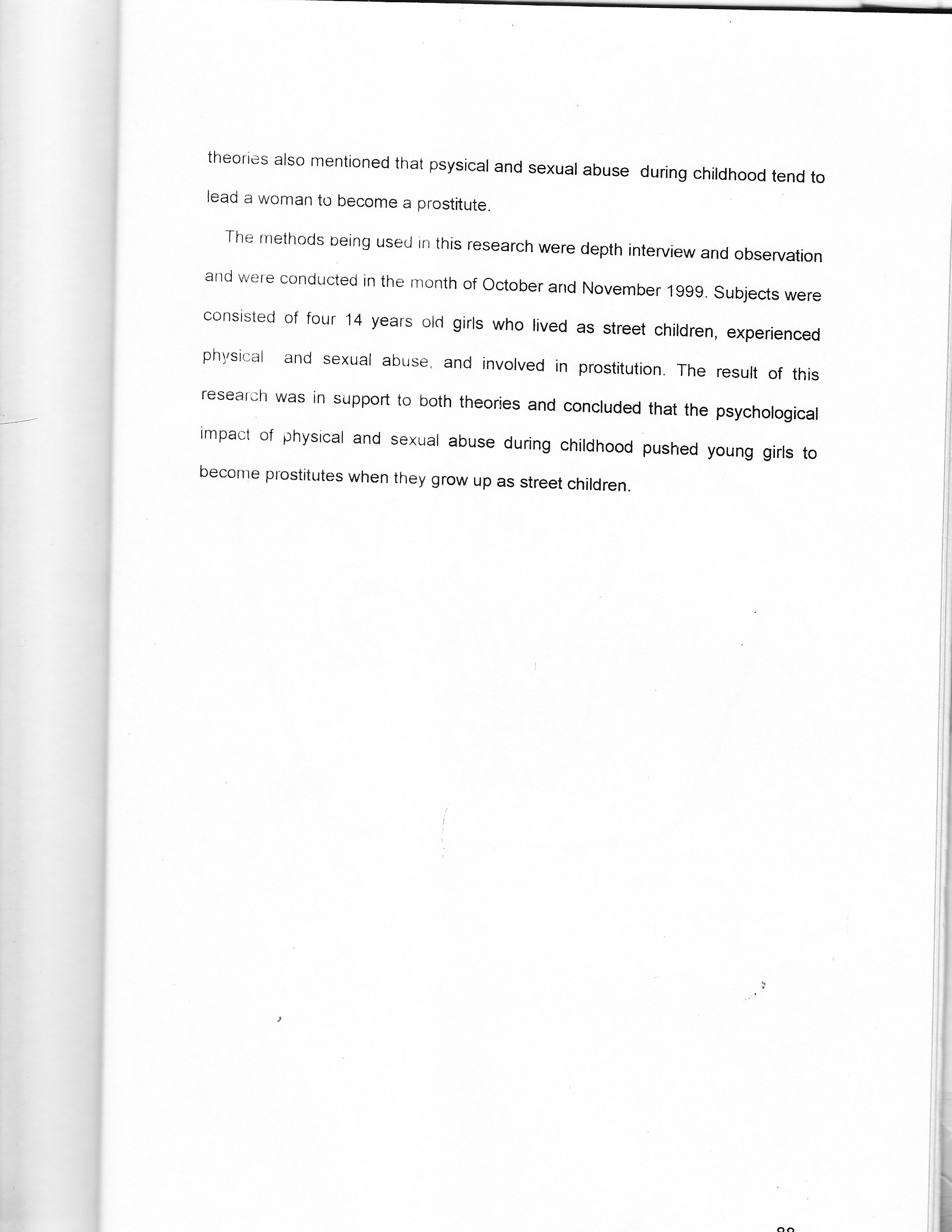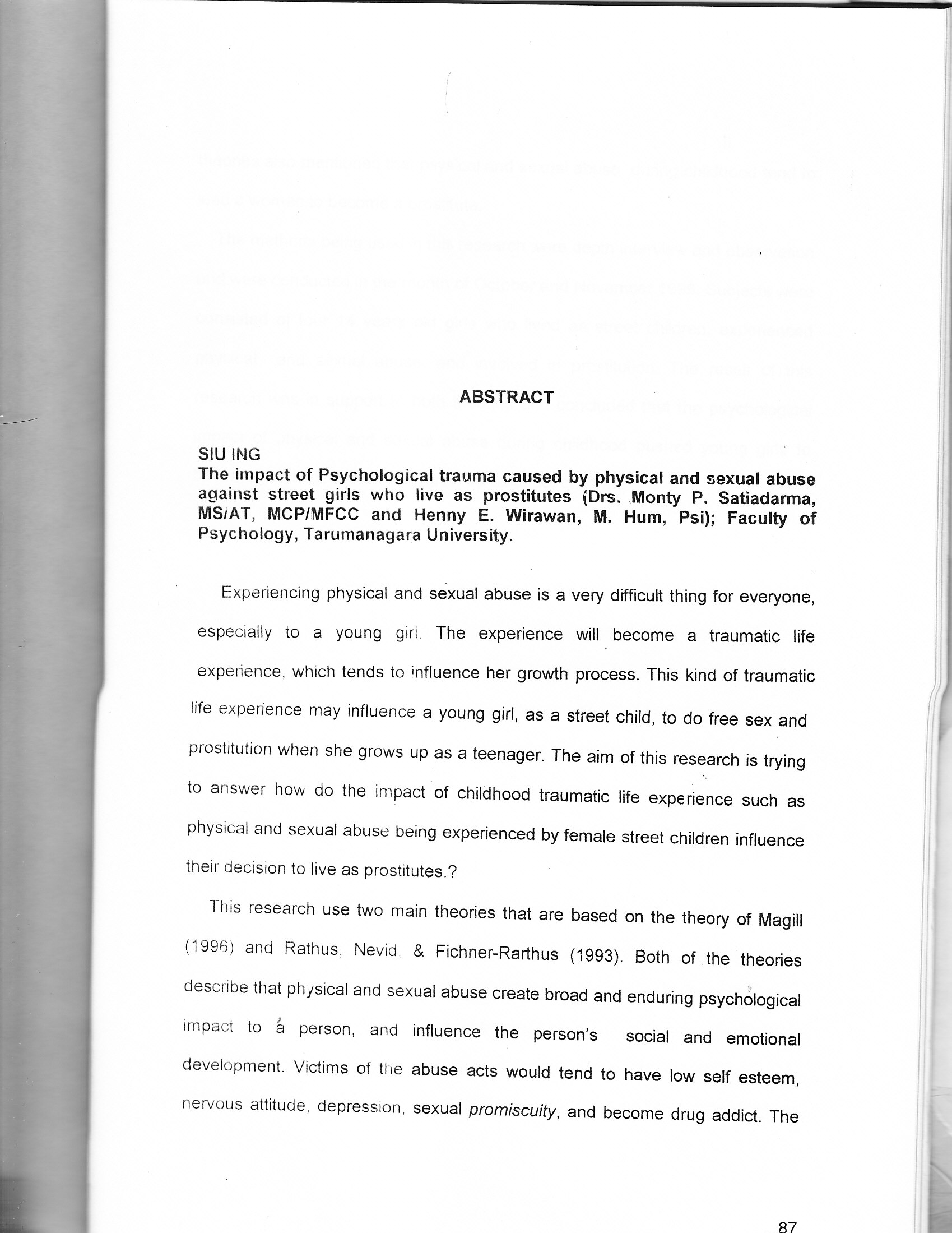 "Experiencing physical and sexual abuse is a very difficult thing for everyone, especially to a young girl. The experience will , become a traumatic life experience, which tends to influence her growth process. This kind of traumatic life experience may influence a young girl, as a street child, to do free sex and prostitution when she grows up as a teenager. The aim of this research is trying to answer how do the impact ‘of childhood traumatic life experience such as physical and sexual abuse being experienced by female street children influence their decision to live as prostitutes? This research use two main theories that are based on the theory of Magill (1996) and Rathus, Nevid, & Fichner-Rarthus (1993). Both ofthe theories describe that physical and sexual abuse create broad and enduring psychological impact to a person, and influence the person’s social and emotional development. Victims of the abuse acts would tend to have low self esteem, nervous attitude, depression, sexual promiscuity, and become drug addict. The theories also mentioned that psysical and sexual abuse during childhood tend to lead a woman to become a prostitute. The methods being used in this research were depth interview and observation and were conducted in the month of October and November 1999. Subjects were consisted of four 14 years old girls who lived as street children, experiencedphysical and sexual abuse, and involved in prostitution. The result of this research was in support to both theories and concluded that the psychological impactof physical and sexual abuse during childhood pushed young girls to