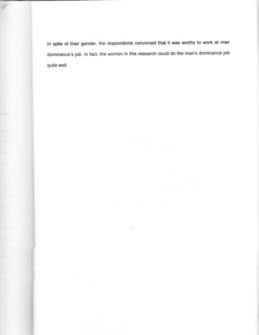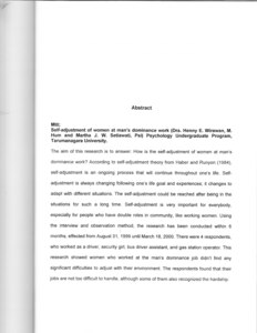 The aim of this research is to answer: How is the self-adjustment of women at man’s dominance work? According to self-adjustment theory from Haber and Runyon (1984), self-adjustment is an ongoing process that will continue throughout one’s life. Self- adjustment is always changing following one’s life goal and experiences; it changes to adapt with different situations. The self-adjustment could be reached after being in the situations for such a long time. Self-adjustment is very important for everybody, especially for people who have double roles in community, like working women. Using the interview and observation method, the research has been conducted within 6 months, effected from August 31, 1999 until March 18, 2000. There were 4 respondents, who worked as a driver, security girl, bus driver assistant, and gas station operator. This research showed women who worked at the man’s dominance job didn’t find any significant difficulties to adjust with their environment. The respondents found that their jobs are not too difficult to handle, although some ofthem also recognized the hardship. in spite of their gender, the respondents convinced that it was worthly to work at man dominance'r job. in fact, the women in this research could do the man's dominance job quite well