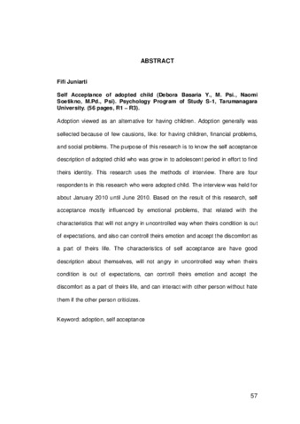 Juniarti, Fifi (2010) Gambaran Penerimaan Diri Pada Anak Adopsi. Skripsi thesis, Universitas Tarumanagara.