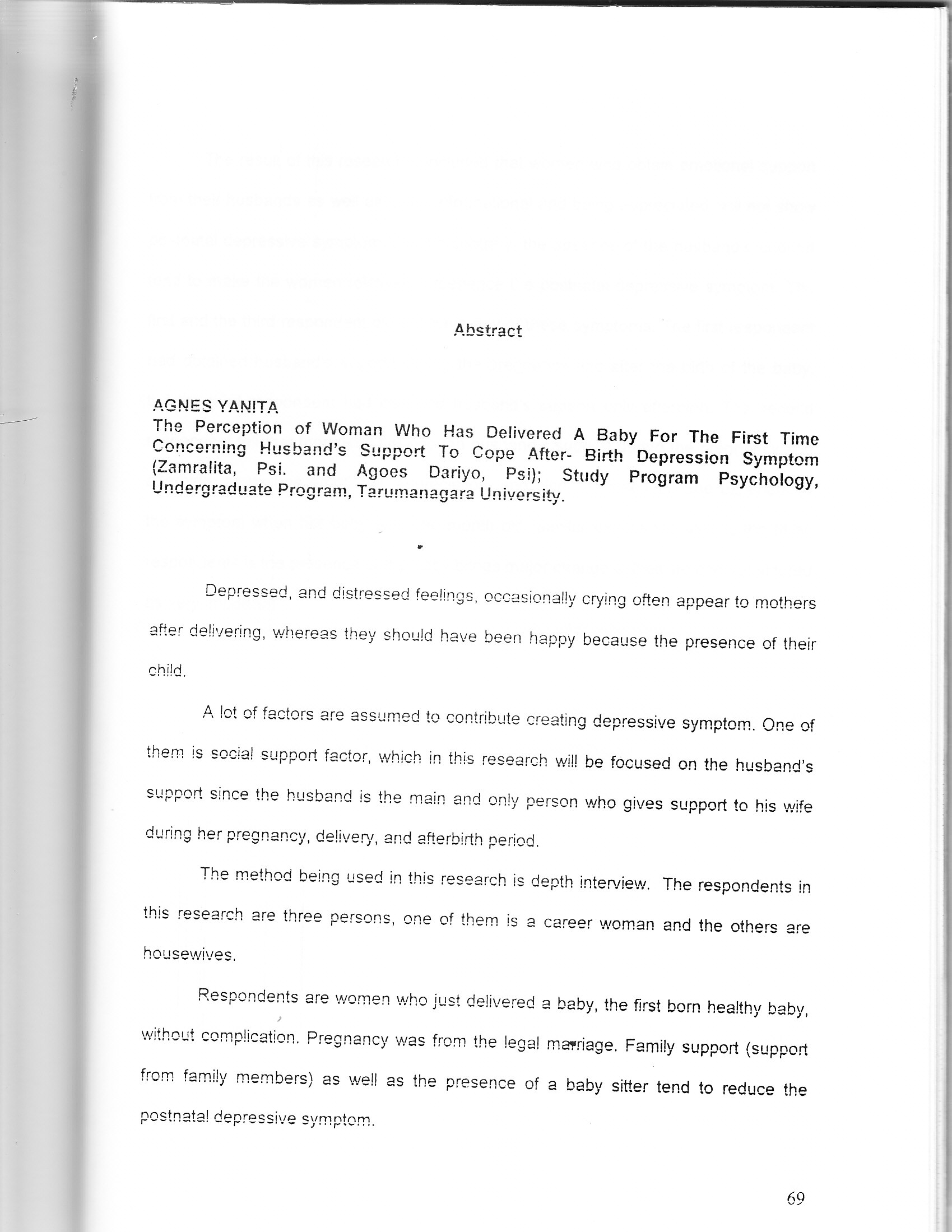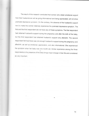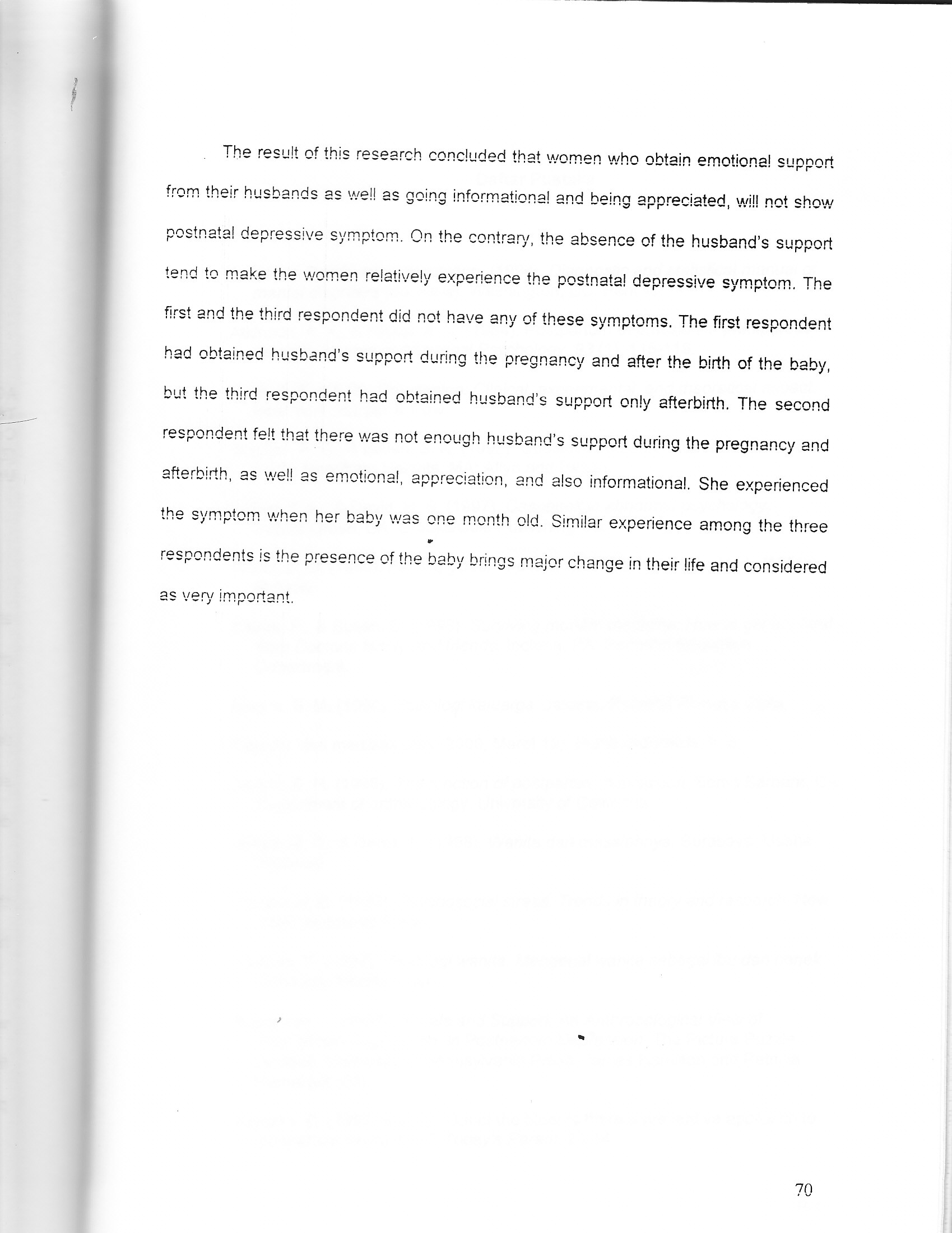 "Depressed, and distressed feelings, occasionally crying often appear to mothers after delivering, whereas they should have been happy because the presence of their child. A lot of factors are assumed to contribute creating depressive symptom. One of them is social support factor, which in this research will be focused on the husband’s support since the husband is the main and only person who gives support to his wife during her pregnancy, delivery, and aiterbirth period. 5 The method being used in this research is depth interview. The respondents in this research are three persons, one of them is a career woman and the others are housewives. Respondents are women who just delivered a baby, the first born healthy baby, without complication. Pregnancy was from the legal marriage. Family support (support from family members) as well as the presence of a baby sitter tend to reduce the postnatal depressive symptompsThe result of this research concluded that women who obtain emotional support from their husbands as well as going informational and being appreciated, will not show postnatal depressive symptom. On the contrary, the absence of the husband’s support tend to make the women relatively experience the postnatal depressive symptom. The first and the third respondent did not have any of these symptoms. The first respondent had obtained husband’s support during the pregnancy and after the birth of the baby, but the third respondent had obtained husband’s support only afterbirth. The second respondent felt that there was not enough husband’s support during the pregnancy and afterbirth, as well as emotional, appreciation, and also informational. She experienced the symptom when her baby was one month old. Similar experience among the three respondents is the presence of the baby brings major change in their life and considered ac mam imnnfiant