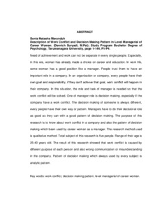 Kebutuhan akan prestasi tidak terlepas dari setiap individu, khususnya wanita. Dalam dunia kerja, kedudukan wanita sudah mampu mencapai posisi yang cukup tinggi, salah satunya menjadi seorang manajer yang memiliiki tujuan dan tanggungjawab masing-masing. Jika hal ini tidak tercapai dengan baik, maka muncul konflik kerja. Dalam konflik kerja inilah peran dan tugas dari seorang manajer harus terlaksana dengan baik agar konflik kerja dapat terselesaikan. Salah satu peran dan tugas dari seorang manajer adalah melakukan decision making. Sebagai manajer, wanita diharapkan dapat mengambil suatu keputusan yang tepat sehingga konflik atau masalah dapat terselesaikan dengan baik. Tujuan utama penelitian ini adalah untuk mengetahui konflik kerja di dalam suatu perusahaan dan pola decision making seperti apa yang digunakan dalam menyelesaikan konflik kerja yang digunakan oleh wanita karir tingkat manajerial. Metode penelitian yang digunakan adalah metode kualitatif. Subyek penelitian berjumlah 5 orang, dengan rentang usia 25-40 tahun. Hasil penelitian ini menunjukkan bahwa konflik kerja terjadi karena perbedaan tujuan dan pola komunikasi yang kurang tepat serta pola decision making yang digunakan oleh semua subyek adalah pola analitik.