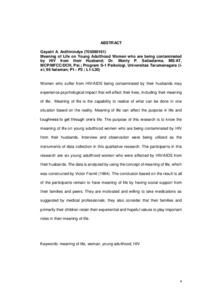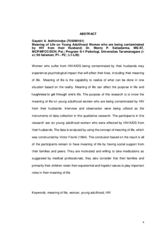 Women who suffer from HIV/AIDS being contaminated by their husbands may experience psychological impact that will affect their lives, including their meaning of life. Meaning of life is the capability to realize of what can be done in one situation based on the reality. Meaning of life can affect the purpose in life and toughness to get through one’s life. The purpose of this research is to know the meaning of life on young adulthood women who are being contaminated by HIV from their husbands. Interview and observation were being utilized as the instruments of data collection in this qualitative research. The participants in this research are six young adulthood women who were affected by HIV/AIDS from their husbands. The data is analyzed by using the concept of meaning of life, which was constructed by Victor Frankl (1964). The conclusion based on the result is all of the participants remain to have meaning of life by having social support from their families and peers. They are motivated and willing to take medications as suggested by medical professionals; they also consider that their families and primarily their children retain their experiential and hopeful values to play important roles in their meaning of life.