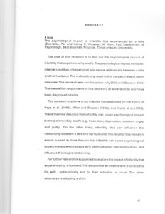 The goal of this research is to find out the psychological impact of infertility that experienced by a wife. The psychological impact includes: internal condition, interpersonal and sexual relationship between a wife and her husband. Them ethod being used in this research was in depth interview. The research was conducted on d uiy 2000 until October 20 00. Th ere were four respondents in this research. all were wom en and have been diagnosed infertile. This research use three m ain theories that are based on the theory of Keye at al., (1995), Miller and Brooten (1996), and Wentz et al, (i988). These theories describe that infertility can cause psychological im pact that experienced by a wife (e.g,, frustration, depression, isolation, angry, and guilty). On the other hand, infertility also can influence the relationship between a wife and herhusband. The result of this research was in support to three theories that infertility can cause psychological im pact that experienced by a wife, like frustration, depression, stress, and influence the coupie relationship. For further research is suggested to explore the im pact of infertimy that 4 experienced by a husband. The solution for an infertile wife is to {acethie life with optimistically and do their activities as 1.13118}. The ether alternative is adopting a child.