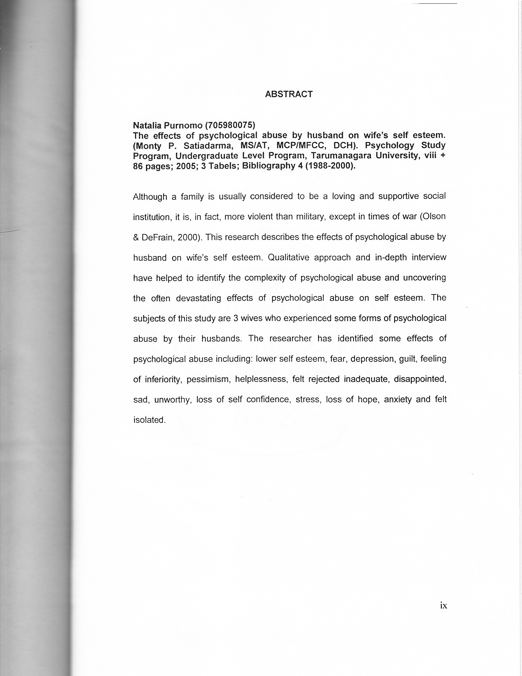 Although a family is usually considered to be a loving and supportive social institution, it is, in fact, more violent than military, except in times of war (Olson DeFrain, 2000). This research describes the effects of psychological abuse by husband on wife's self esteem. Qualitative approach and in-depth interview have helped to identify the complexity of psychological abuse and unoovering the often devastating effects of psychological abuse on self esteem. The subjects of this study are 3 wives who experienced some forms of psychological abuse by their husbands. The researcher has identified some effects of 5 psychological abuse including: lower self esteem, fear, depression, guilt, feeling of inferiority, pessimism, helplessness, felt rejected inadequate, disappointed, sad, unworthy, loss of self confidence, stress, loss of hope, anxiety and felt isolated.