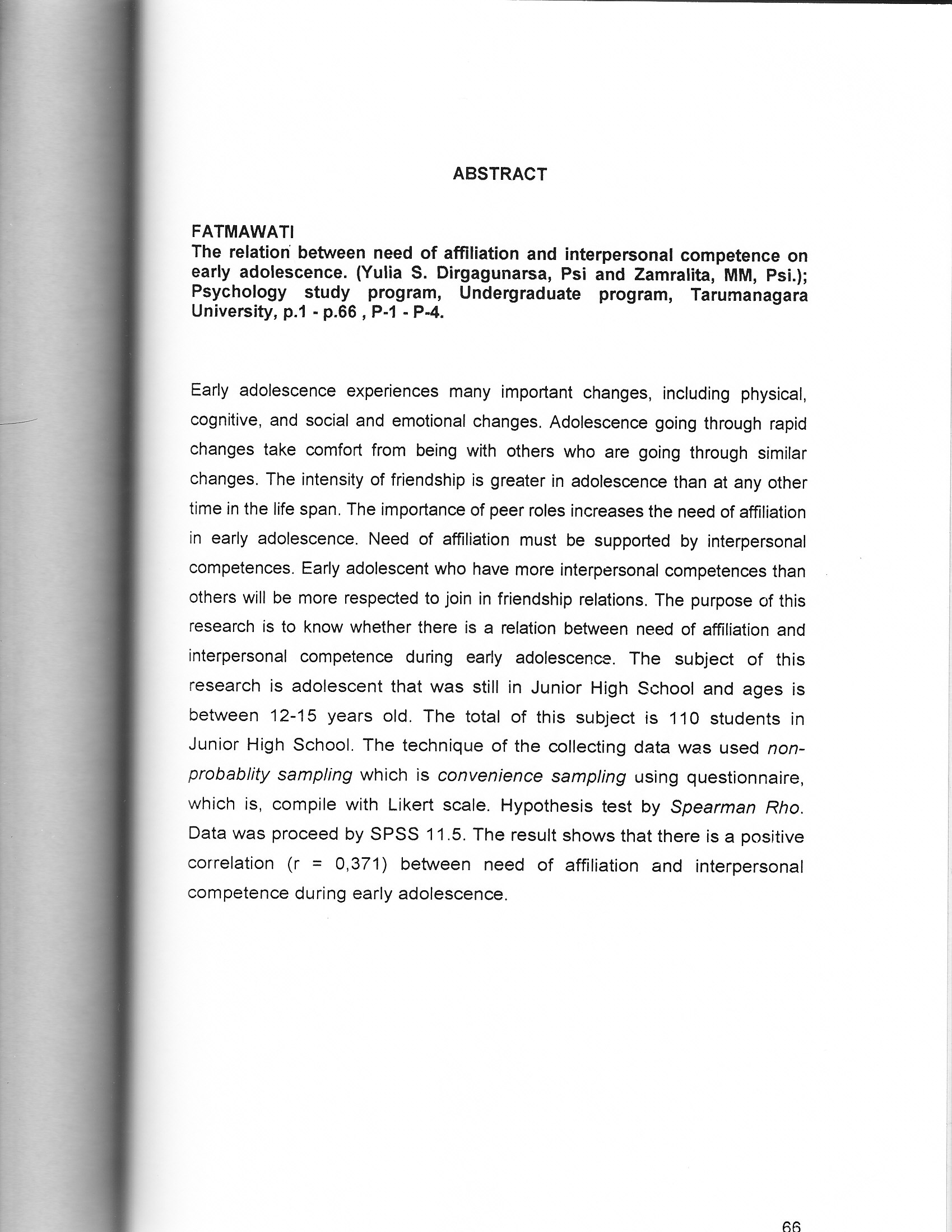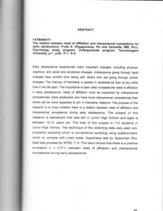 Early adolescence experiences many important changes, including physical, cognitive, and social and emotional changes. Adolescence going through rapid changes take comfort from being with others who are going through similar changes. The intensity of friendship is greater in adolescence than at any other time in the life span. The importance of peer roles increases the need of afnliation in early adolescence. Need of affiliation must be supported by interpersonal competences. Early adolescent who have more interpersonal competences than others will be more respected to join in friendship relations. The purpose of this research is to know whether there is a relation between need of affiliation and interpersonal competence during early adolescence. The subject of this research is adolescent that was still in Junior High School and ages is between 12-15 years old. The total of this subject is 110 students in Junior High School. The technique of the collecting data was used non- probablity sampling which is convenience sampling using questionnaire, which is, compile with Likert scale. Hypothesis test by Spearman Rho. Data was proceed by SPSS 11.5. The result shows that there is a positive correlation (r = 0,371) between need of affiliation and interpersonal competence during early adolescence.