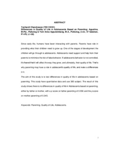 "Since early life, humans have been interacting with parents. Parents have role in providing what their children need to grow up. One of the stages of development the children will go through is adolescents. Adolescents need support and help from their parents to minimize the risk of false behavior. If adolescents behavior is not controlled, it’s feared that it will affect the way they grow, and ultimately, their quality of life. That’s why parenting may have a role in adolescent’s quality of life, and make a differences in it.