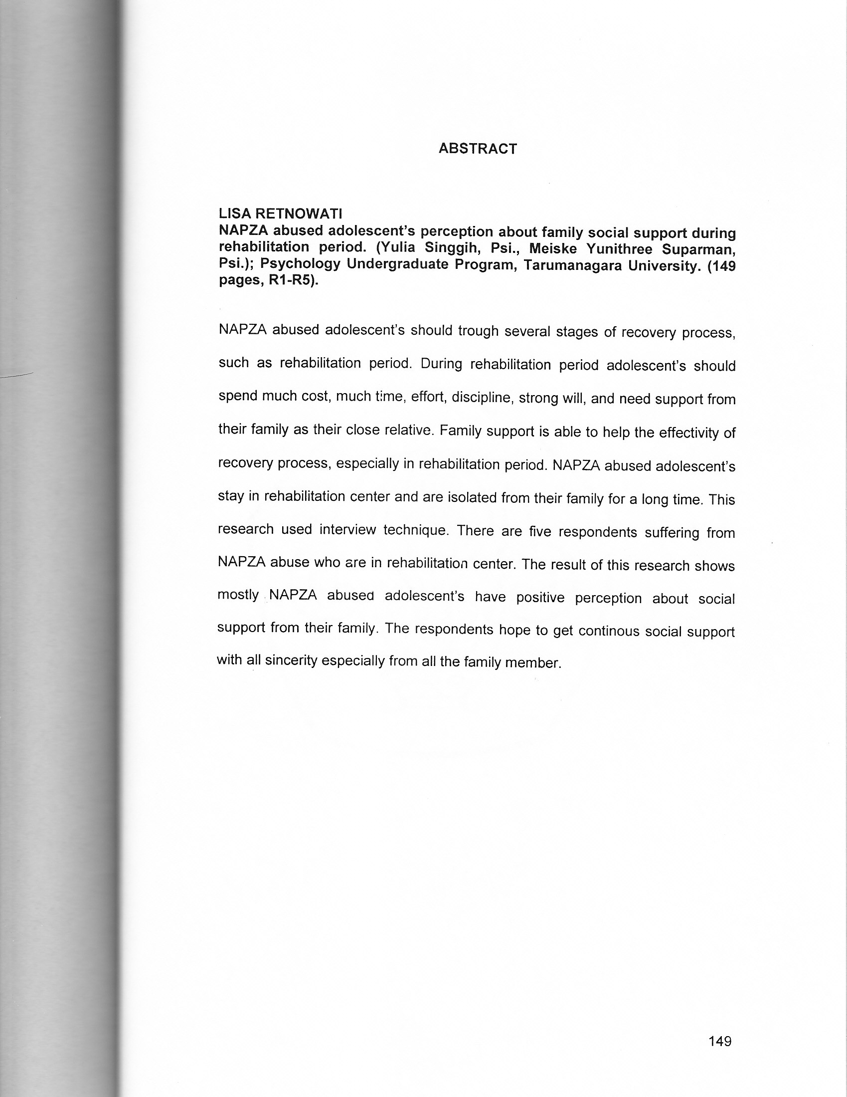 Retnowati, Lisa (2005) Persepsi remaja ketergantungan NAPZA mengenai dukungan keluarga selama masa rehabilitasi. Skripsi thesis, universitas Tarumanagara.