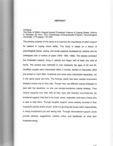 The primary purpose of this study is to examine the importance of wife's support for pastors in coping stress ability. This study is based on a theory of psychological stress, coping, and social supports developed by Lazarus and his colleagues over a number of years (1976, 1984, 1986). The sample consisted five Protestant pastors, living in Jakarta and Bogor with at least one child at home. The sample was restricted to man betweens the ages of 40 and 65. Qualified couples were interviewed within 5 months, started on December 2004 and ended on April 2005. Husbands and wives were interviewed separately, yet in the same place and time. The findings clarify that each sample encounters stressful events due to their jobs. Though they use different coping strategies to deal with the situations, no one use escape-avoidance coping strategy. They receive supports from their wife as they cope with stressful circumstances. By emotional support, they feel to be loved, cared, respected, and have a friend who is able to help them. Through tangible support, wives actively involved in their husband's activity at the church, while not ignoring the house wife's responsibility in doing household's job and raising kids. Through informational support, wives provide advices, suggestions, positive critics, and feedbacks on what their husbands doing.