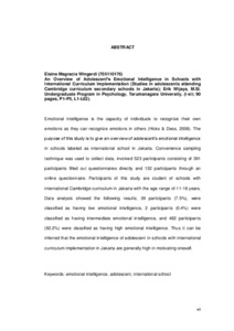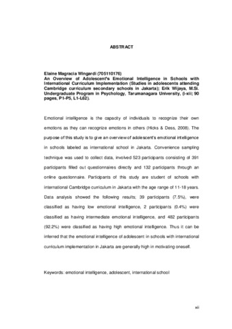 Magracia Wingardi, Elaine (2015) Gambaran kecerdasan emosional pada remaja yang bersekolah dengan penerapan kurikulum internasional (Studi pada remaja sekolah menengah yang menggunakan kurikulum Cambridge di Jakarta). Skripsi thesis, Universitas Tarumanagara.