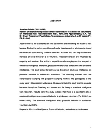 Gabriel, Amadea (2015) Peran kecerdasan emosi terhadap perilaku proposal pada relawan remaja di Yayasan Buddha Tzu Chi Indonesia. Skripsi thesis, Universitas Tarumanagara.