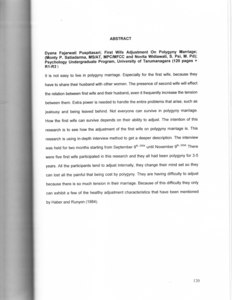lt is not easy to live in polygyny marriage. Especially for the first wife, because they have to share their husband with other women. The presence of second wife will effect the relation between first wife and their husband, even it frequently increase the tension between them. Extra power is needed to handle the entire problem's that arise, such as 1 jealousy and being leaved behind. Not everyone can survive in polygyny marriage. How the first wife can survive depends on their ability to adjust. The intention of this research is to see how the adjustment of the first wife on polygyny marriage is. This research is using in-depth interview method to get a deeper description. The interview was held for two months starting from September 9“ 20“ until November 9… 20“ There were five first wife participated in this research and they all had been polygyny for 3-5 years. All the participants tend to adjust internally, they change their mind set so they can lost all the painful that being cost by polygyny. They are having difficulty to adjust because there is so much tension in their marriage. Because of this difficulty they only can exhibit a few of the healthy adjustment characteristics that have been mention-ed by Haber and Runyon (1984).