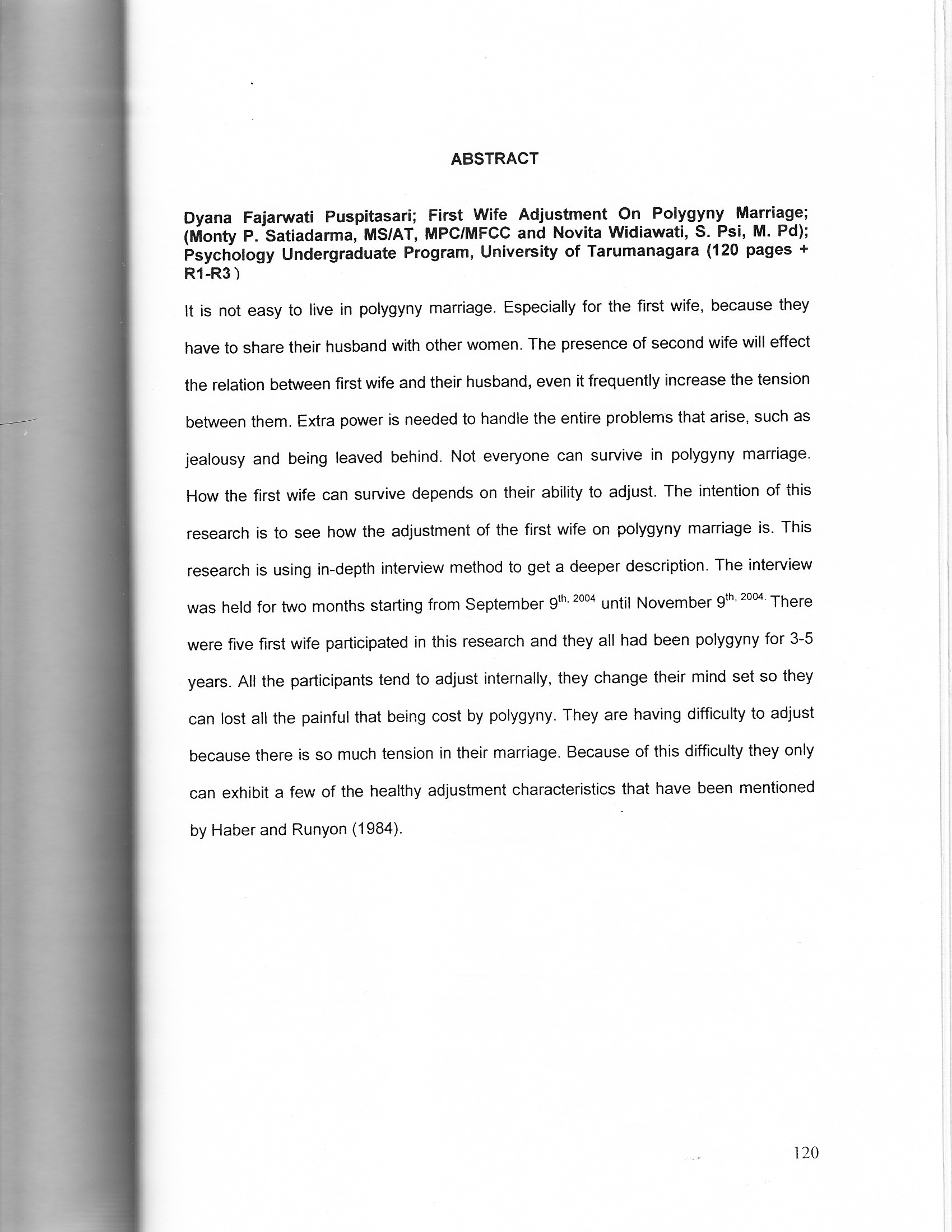 Fajarwati, Dyana (2005) Penyesuaian diri isteri pertama dalam perkawinan poligini. Skripsi thesis, universitas Tarumanagara.