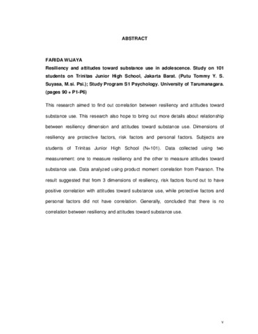 "This research aimed to find out correlation between resiliency and attitudes toward substance abuse. This research also hope to bring out more details about relationship between resiliency dimension and attitudes toward substance abuse. Dimensions of resiliency are protective factors, risk factors and personal factors. Subjects are students of Trinitas Junior High School (N=101). Data collected using two measurement: one to measure resiliency and other to measure attitudes toward substance abuse. Data analyzed using product moment correlation from Pearson. The result suggested that from 3 dimensions of resiliency, 1 of them found out to have positive correlation with attitudes toward substance abuse, while the other 2 did not have correlation. Generally, concluded that there is no correlation between resiliency and attitudes toward substance abuse.